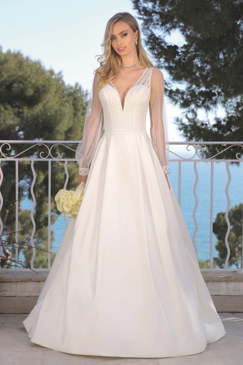 Trouwjurk 421043 van het merk Ladybird. Deze jurk in klassieke stijl heeft afneembare lange mouwen en daardoor 2 looks in 1! De top heeft een sweetheart halslijn met schouderbandjes en een schitterende rug kant. De wijde rok is gemaakt van chique satijn.