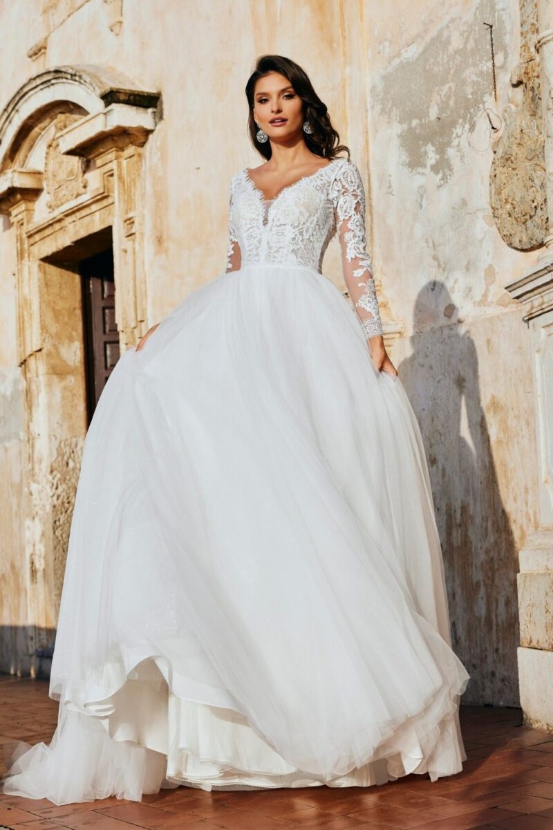 Trouwjurk 52058 van het merk Veni Infantino. Deze jurk heeft een prachtig kanten lijfje met afneembare lange mouwen. Perfect om 2 looks in 1 te creëren! De wijde prinsessenrok is gemaakt van subtiele glittertule en de diepe V-rug is voorzien van een afneembare strik.