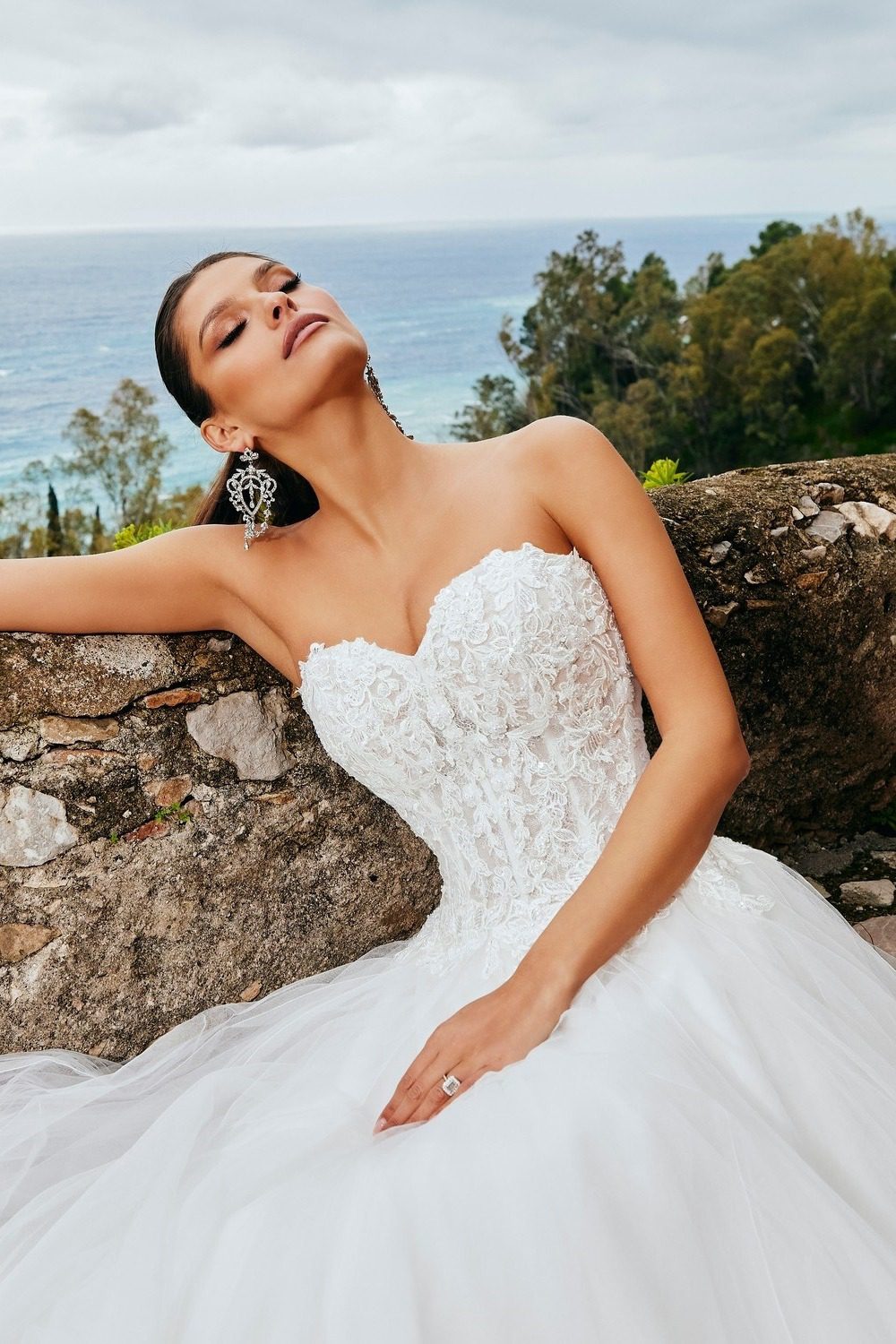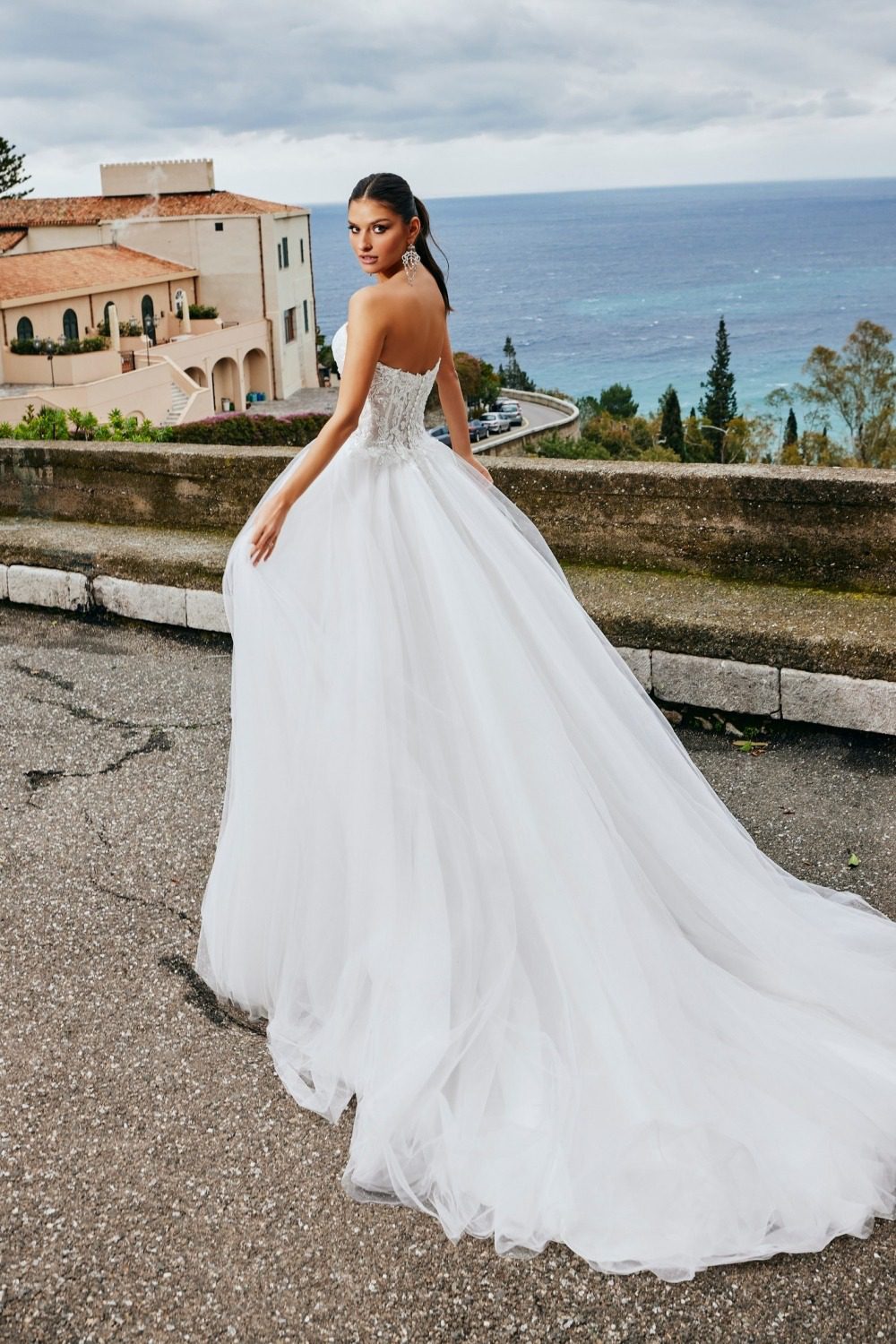 Trouwjurk 52072 van het merk Veni Infantino. De ultieme prinsessenjurk voor een grootste entree op je bruiloft. Het strapless lijfje heeft een elegante sweetheart halslijn en is voorzien van sprankelend kant en kralen. De wijde rok is gemaakt van vele lagen romantische tule en eindigt natuurlijk met een lange sleep.