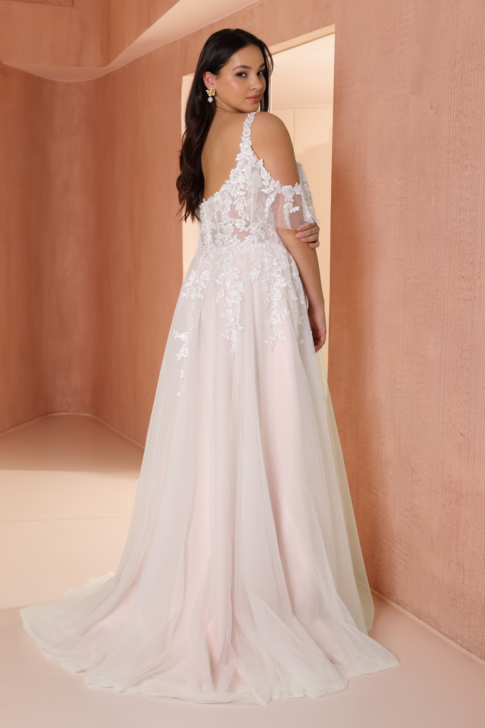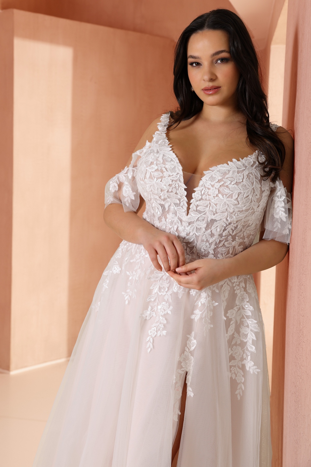 Trouwjurk AMBER van het merk Azuree. Deze trouwjurk is voorzien van een lijfje met kant en een V halslijn. De rok is gemaakt van luchtige tule en voorzien van een sexy split. Ook heeft deze jurk afneembare off-the-shoulder mouwtjes voor een geheel andere look!