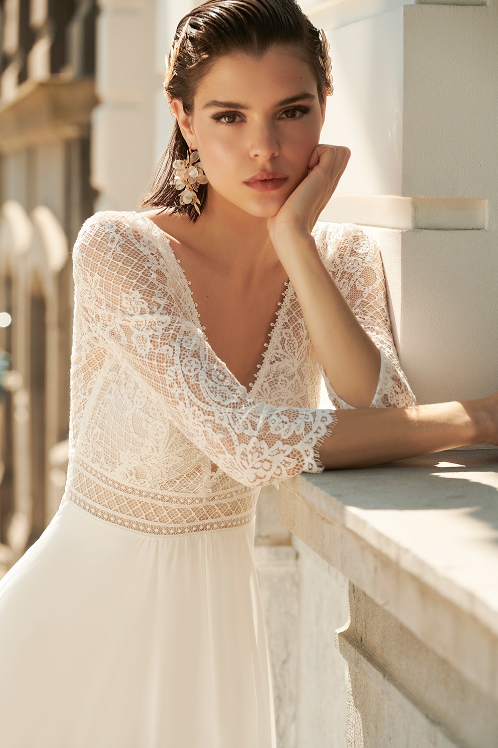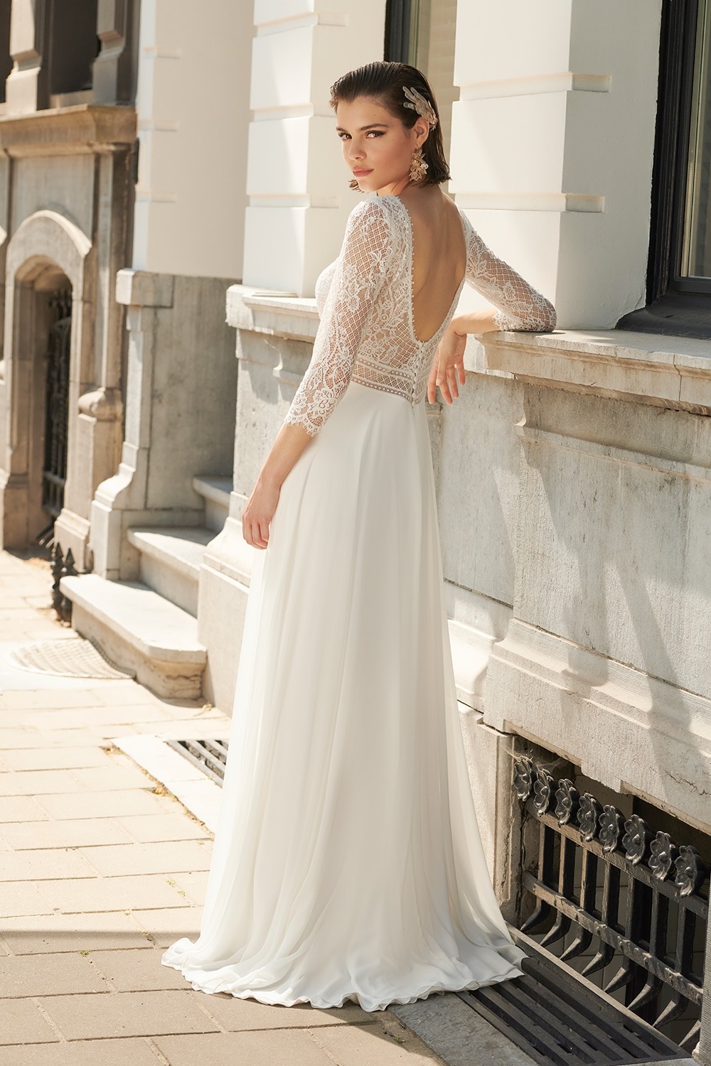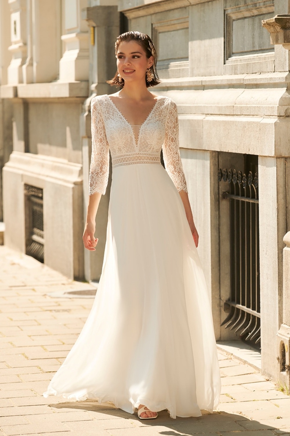 Trouwjurk CAMARILLO van het merk Marylise. Deze stijlvolle boho jurk is gemaakt van chiffon en heeft een A-lijn silhouet. De top met lange mouwen is voorzien van verfijnd kant en heeft een V-hals. De prachtige mouwen, taille en rug zijn doorschijnend.