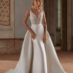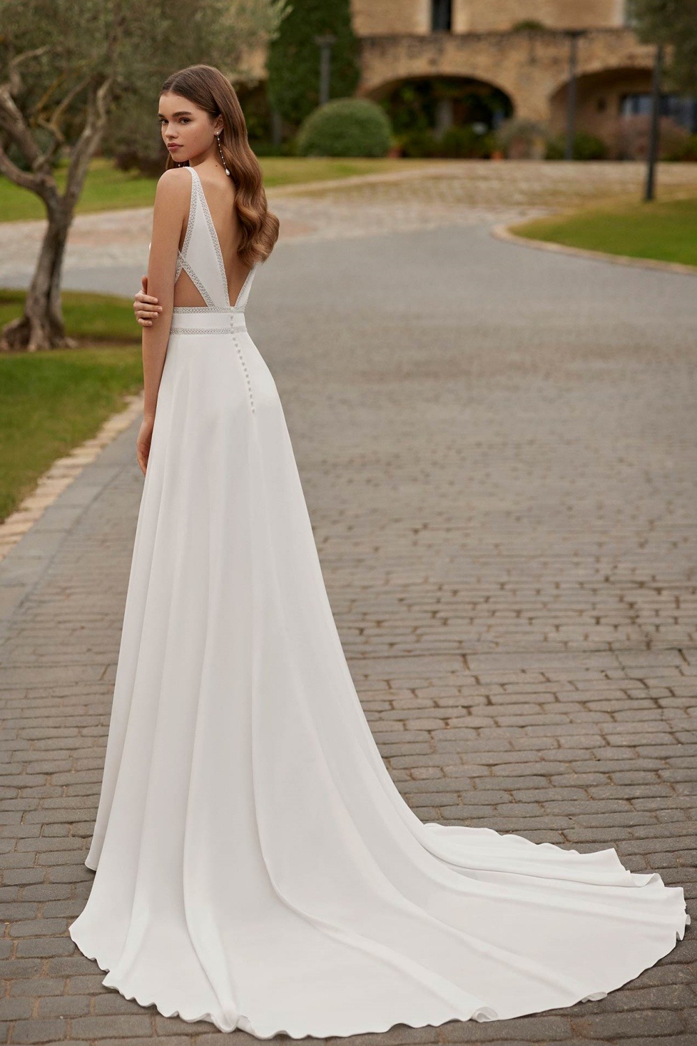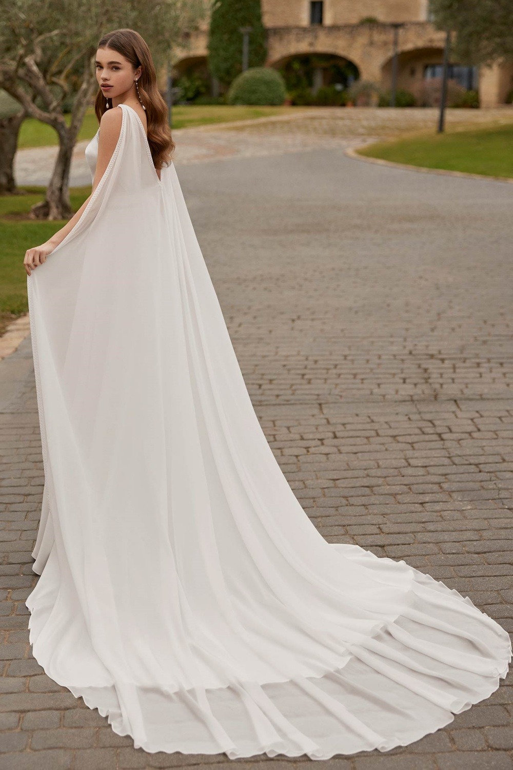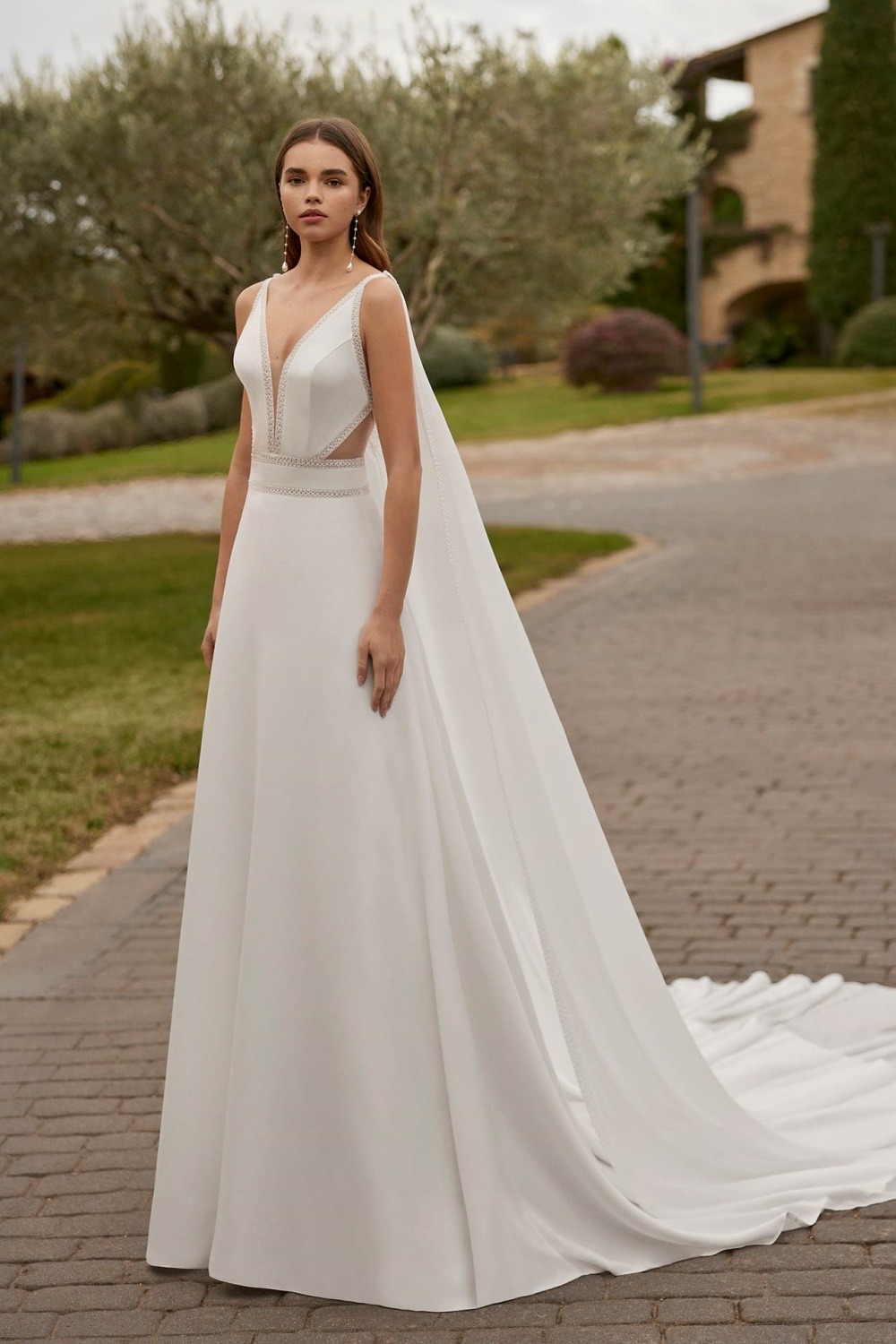 Trouwjurk GALILEA van het merk Rosa Clara. Deze trouwjurk heeft een vloeiende en eenvoudige lange mantel. De trouwjurk is gemaakt van crêpe en gecombineerd met kant, de diepe halslijn, V-rug en bandjes maken de look compleet.