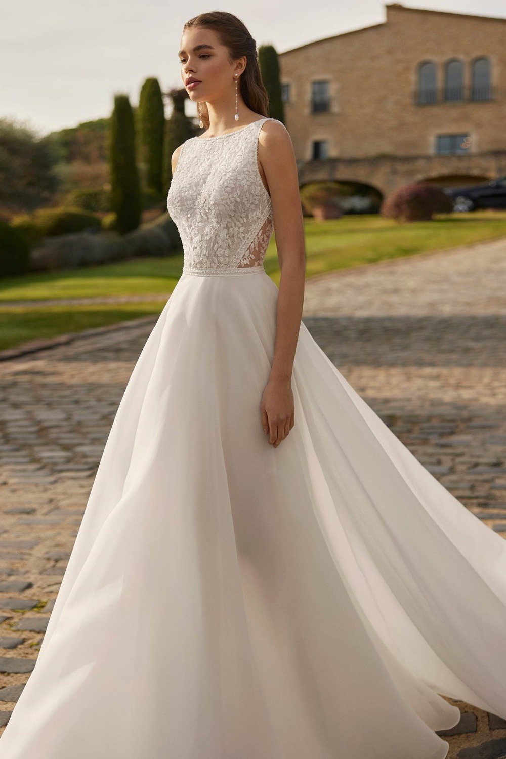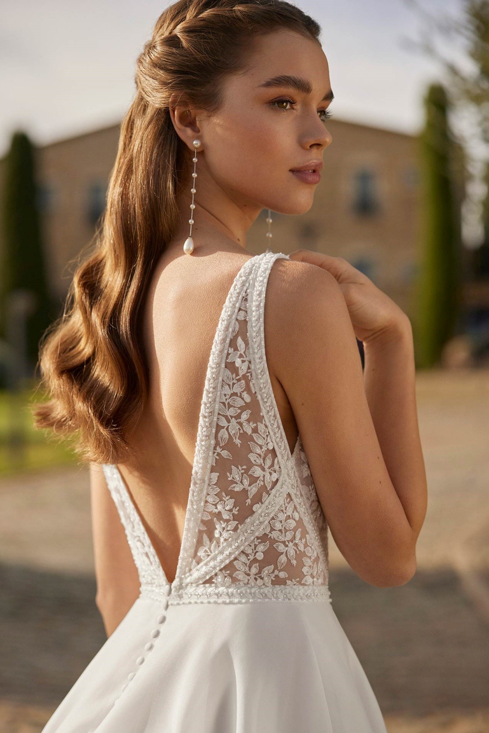 Trouwjurk GILMA van het merk Rosa Clara. Deze A-lijn trouwjurk is gemaakt van kant met een garza rok. De trouwjurk heeft een boothals en V-rug met bandjes.
