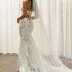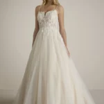Trouwjurk HARVEY van het merk Alma Novia. Een bohemian style jurk met soepel vallende rok en stijlvolle pofmouwen van chiffon. De gedetailleerde top is gemaakt van guipure kant en is voorzien van een V-hals met open rug accent.