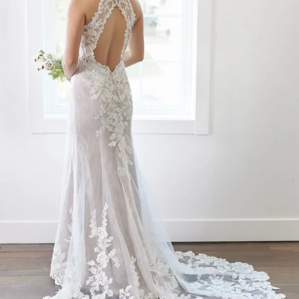 Trouwjurk HAZEL LYNETTE van het merk Rebecca Ingram. Deze stijlvolle fit & flare jurk met bloemenaccenten laat je figuur prachtig uitkomen. De jurk heeft een hoge halter halslijn en de opvallende rug is voorzien van een keyhole-rug. De gehele jurk is afgewerkt met luxe kant applicaties.