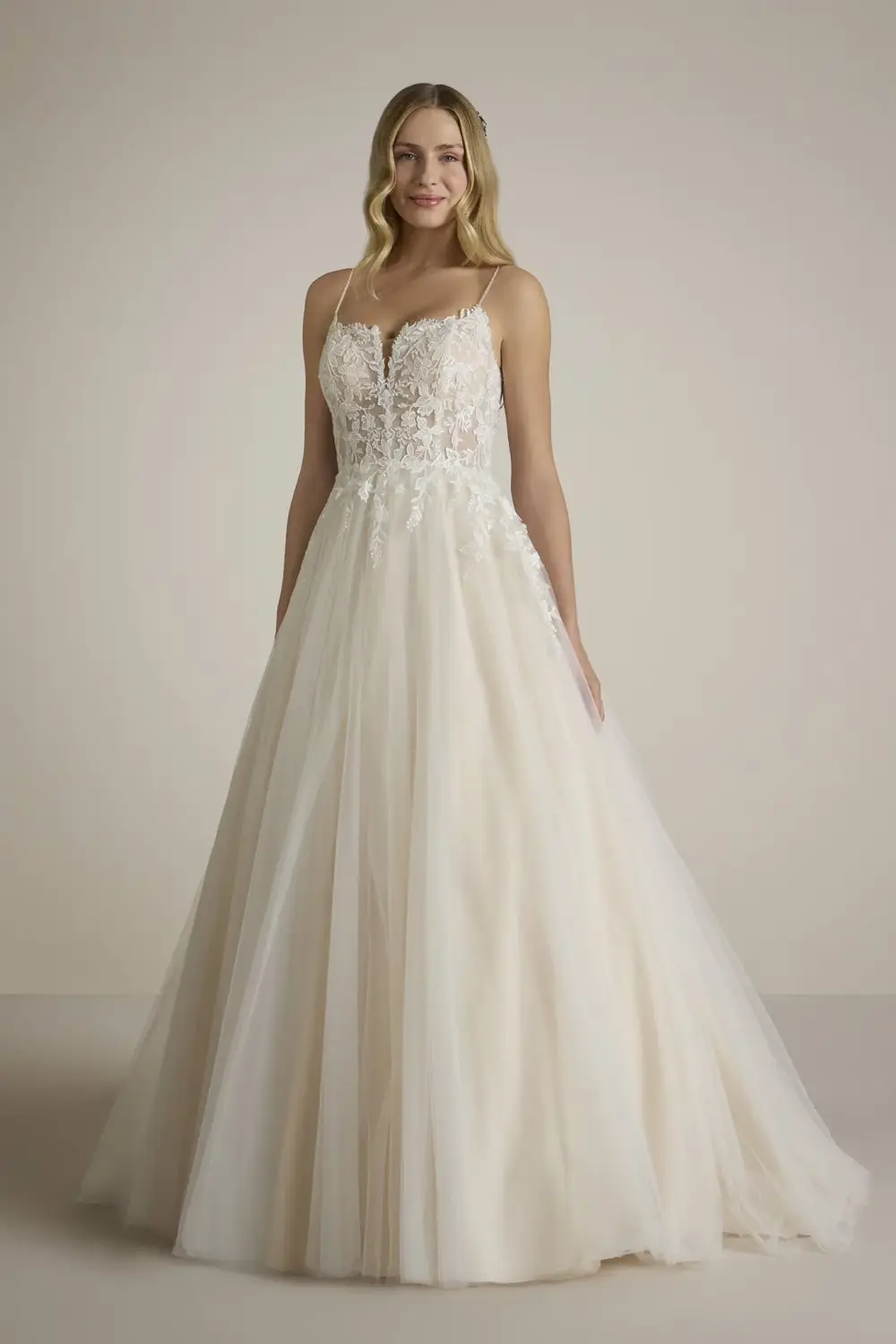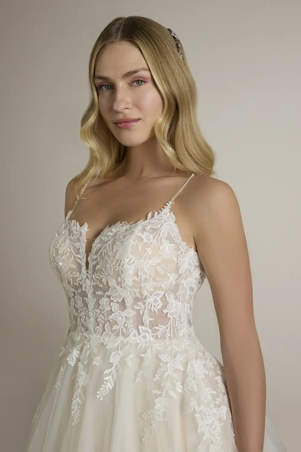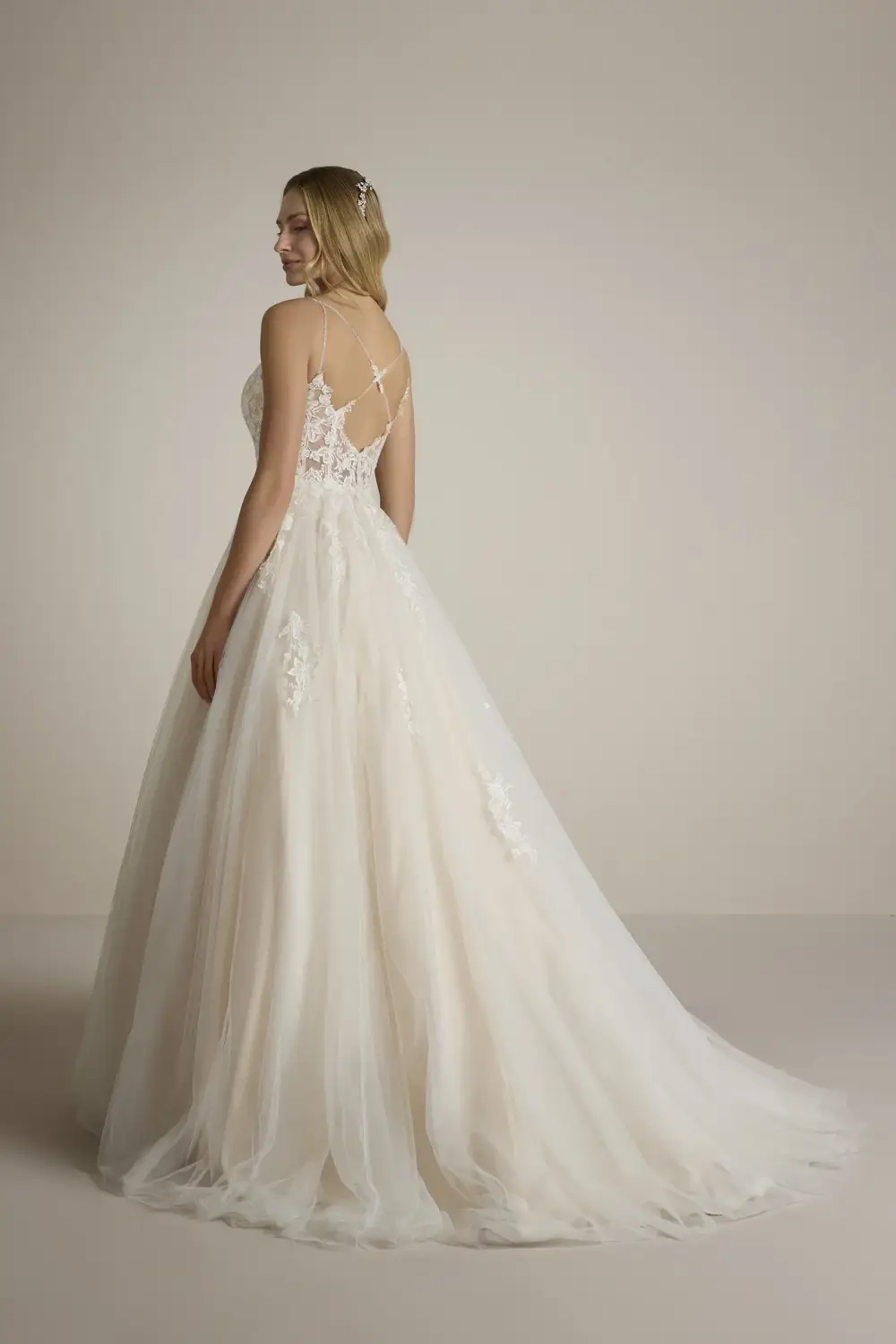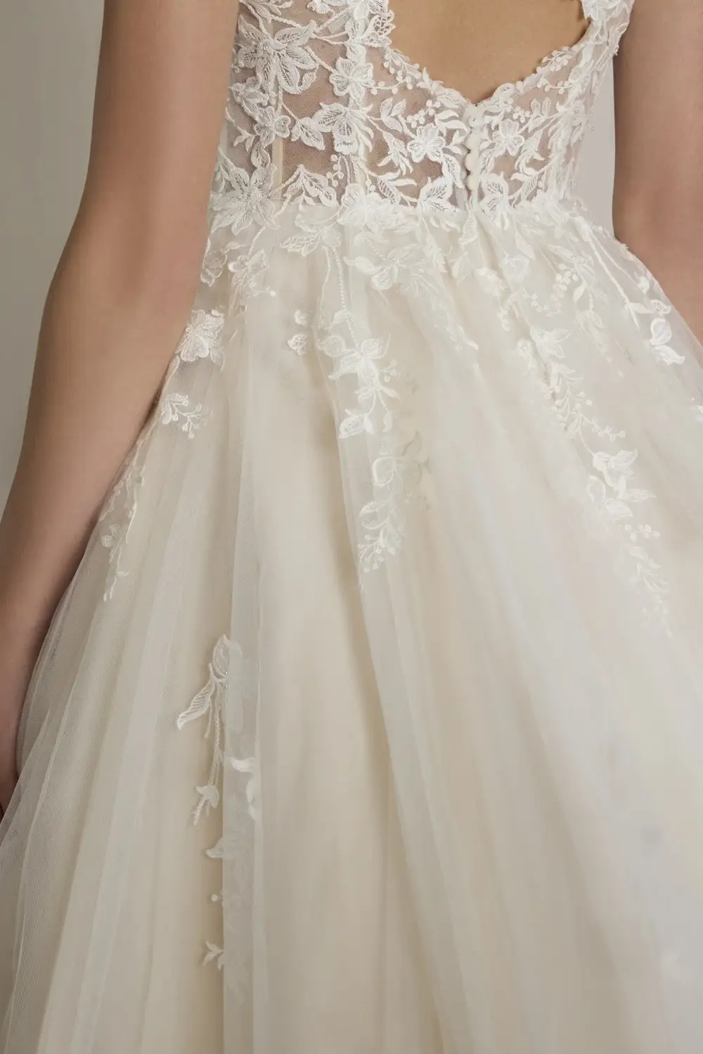Trouwjurk HILMI Ladybird. Het lijfje heeft een moderne rechte halslijn en de schouderbandjes kruisen elkaar op de rug. De jurk is voorzien van een A-lijn silhouet waarbij je taille wordt geaccentueerd. Sierlijke kant applicaties en zachte tule zorgen voor een romantische uitstraling.