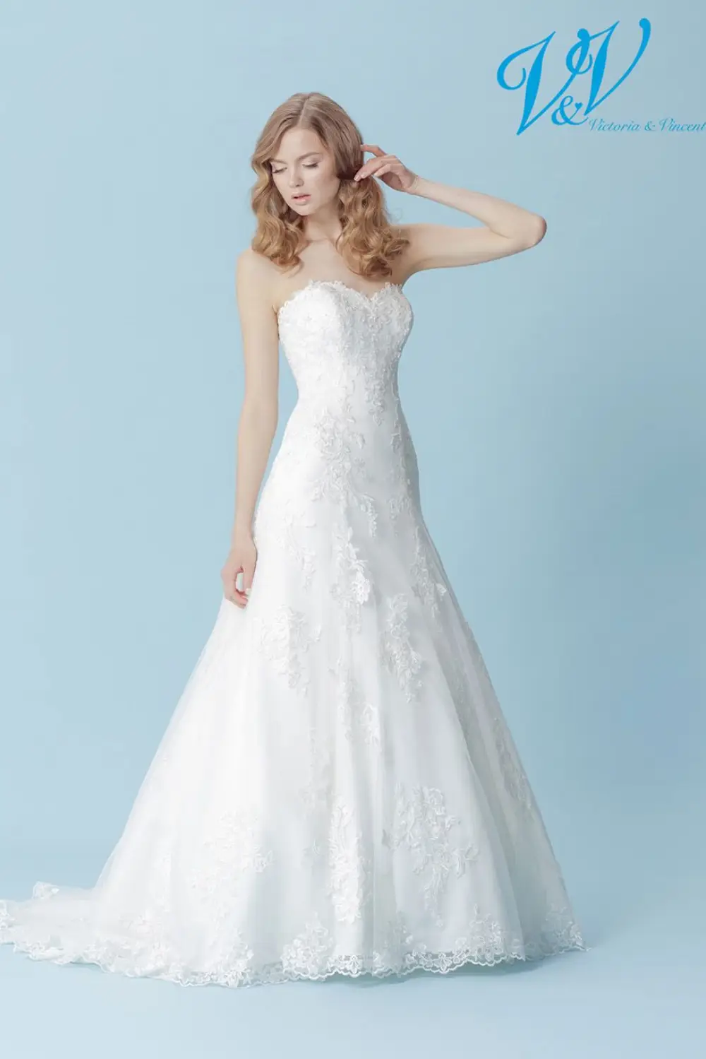 Trouwjurk HOLLY Victoria & Vincent. Klassieke trouwjurk met A-lijn rok en romantische sleep. De sweetheart top is strapless en de gehele jurk is voorzien van prachtig kant.