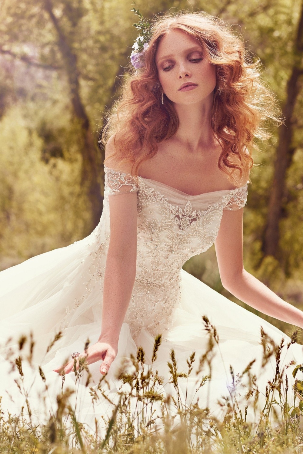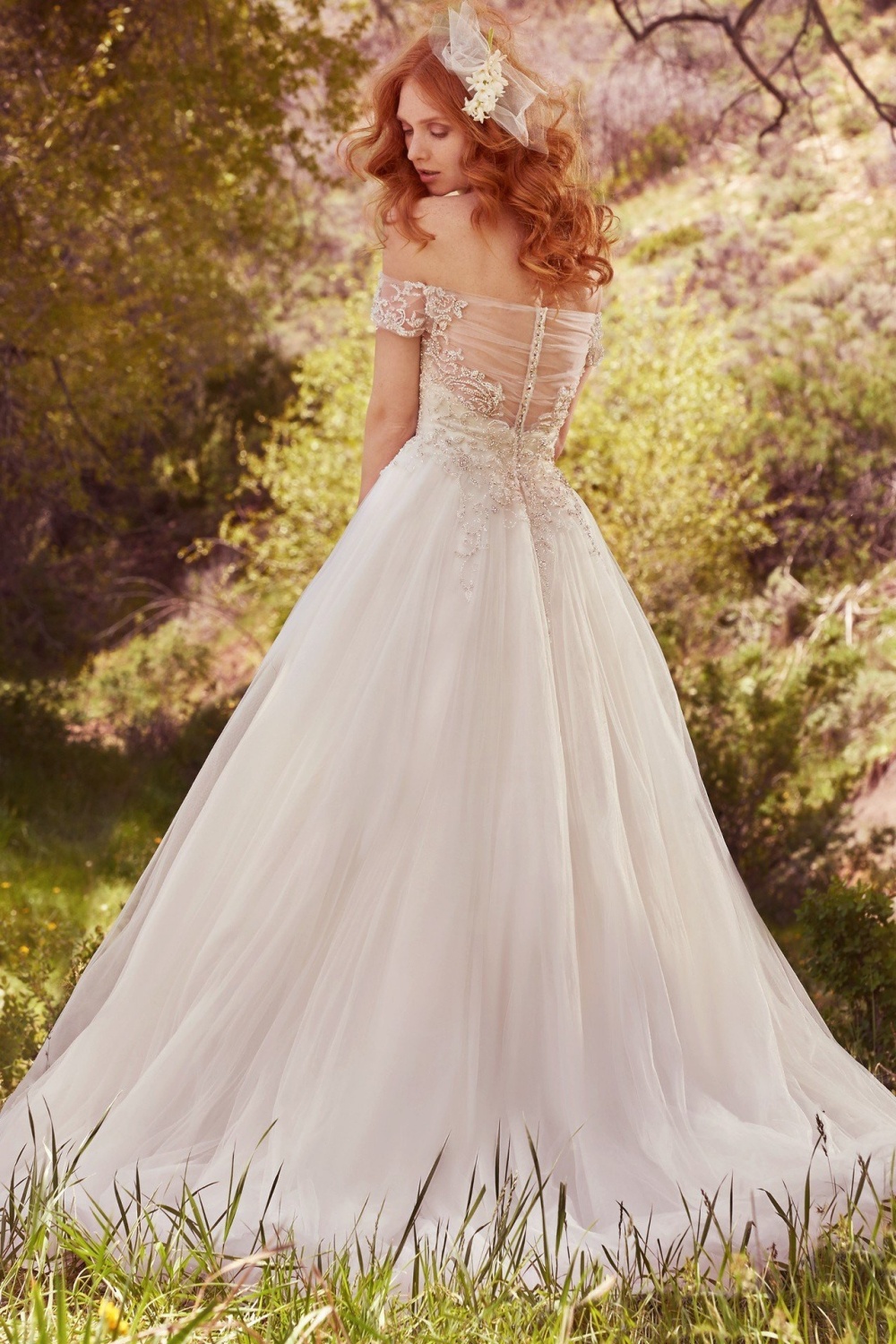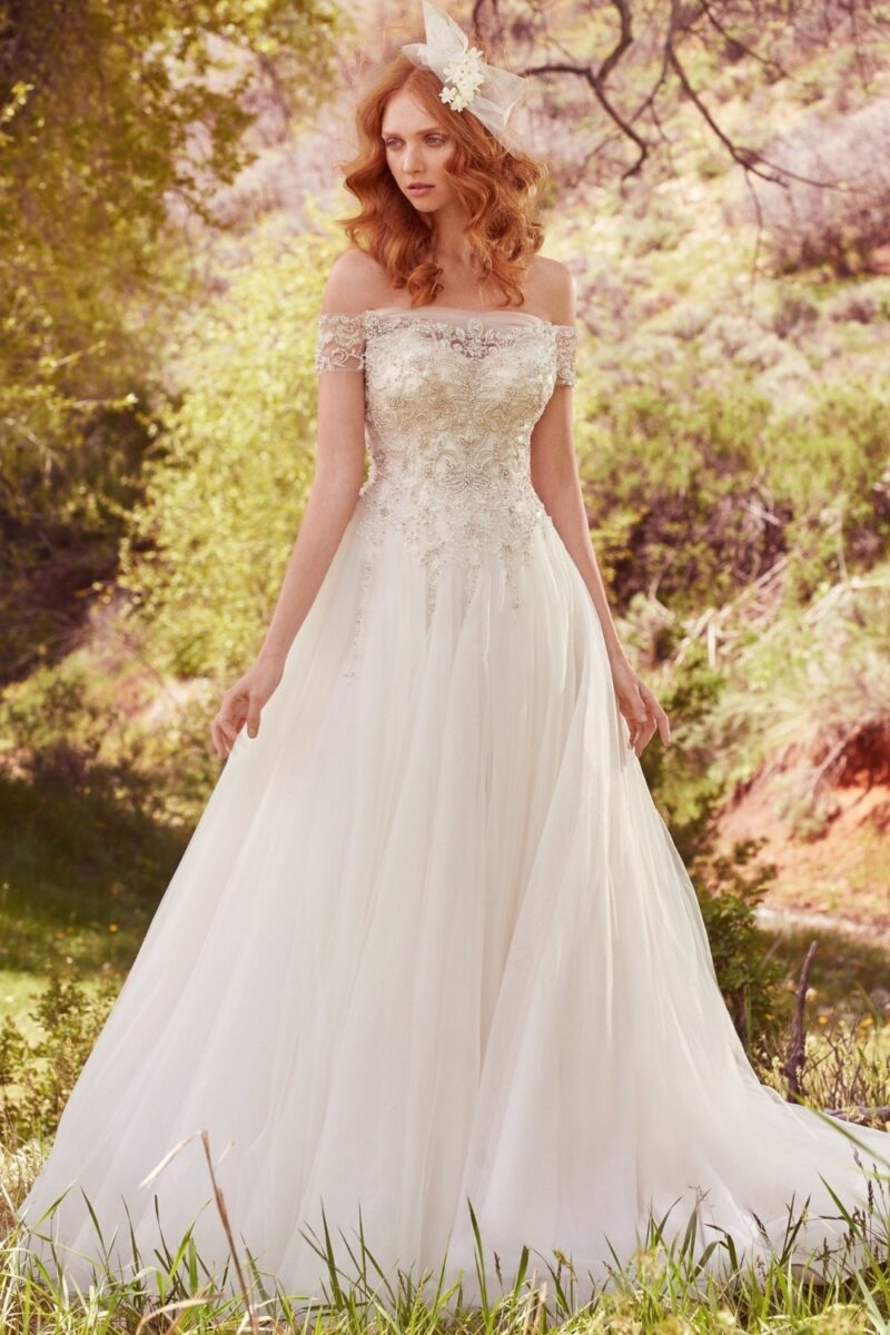 Trouwjurk Iris van het merk Maggie Sottero. Deze bijzondere jurk heeft een sweetheart top bewerkt met diamantjes en tule. De mouwtjes zijn off-shoulder en deze lopen door naar de prachtige doorschijnende rug van tule. De rok is wijd uitlopend.