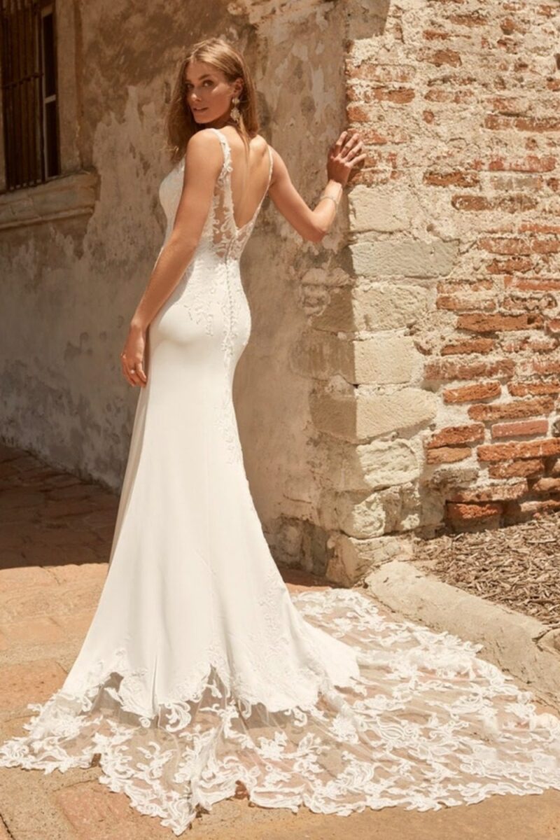 Trouwjurk MAYURI van het merk Maggie Sottero. Deze fit & flare trouwjurk sluit aan op je lichaam en is gemaakt van crepe. De gladde rok is gecombineerd met een prachtig kanten lijfje. De top is voorzien van een V-hals met schouderbanden en een sexy lage rug. De indrukwekkende sleep is afgewerkt met tule en kant.