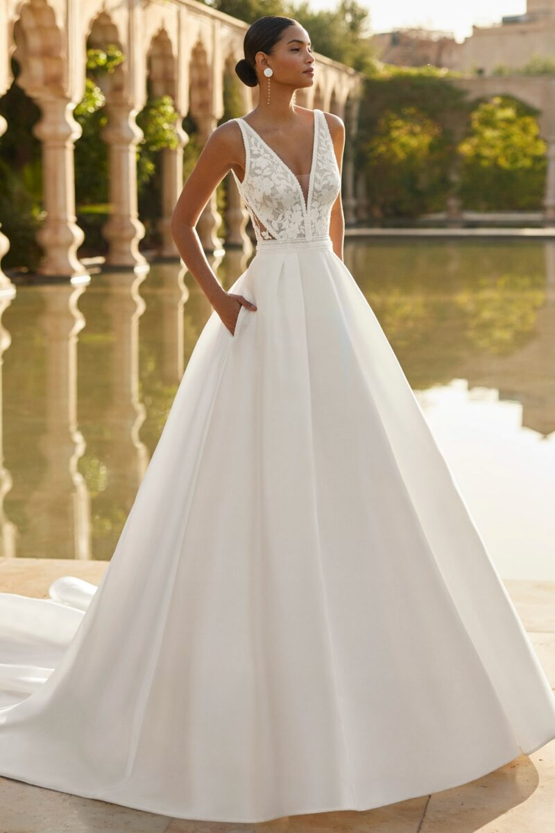 Trouwjurk OREA van het merk Rosa Clara. Deze elegante trouwjurk combineert tijdloze klasse met moderne details. De jurk heeft een diepe V-hals met een kanten lijfje dat subtiel doorschijnend is, en een gladde, volle rok van satijn met handige zakken. De taille wordt geaccentueerd door een verfijnde band.
