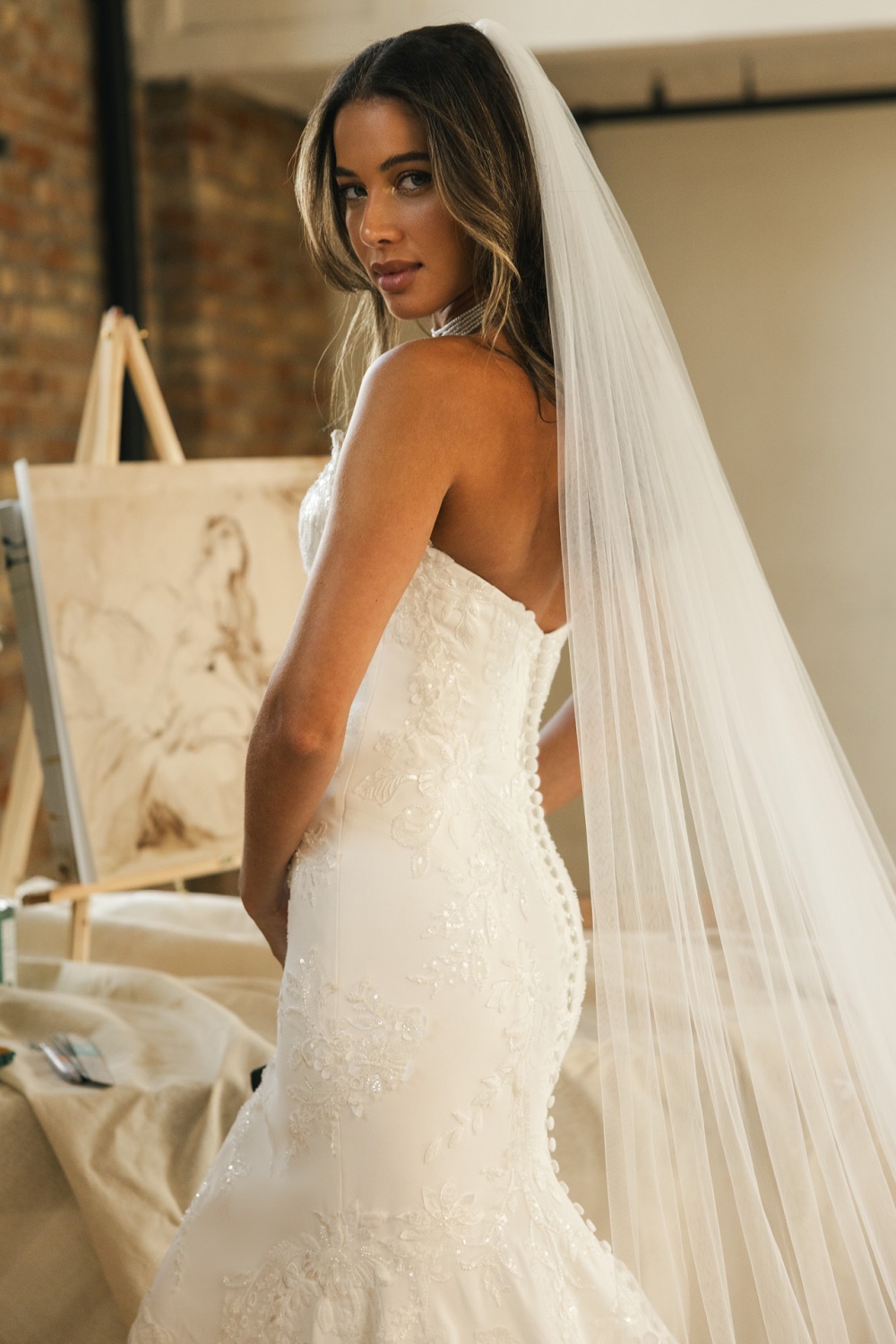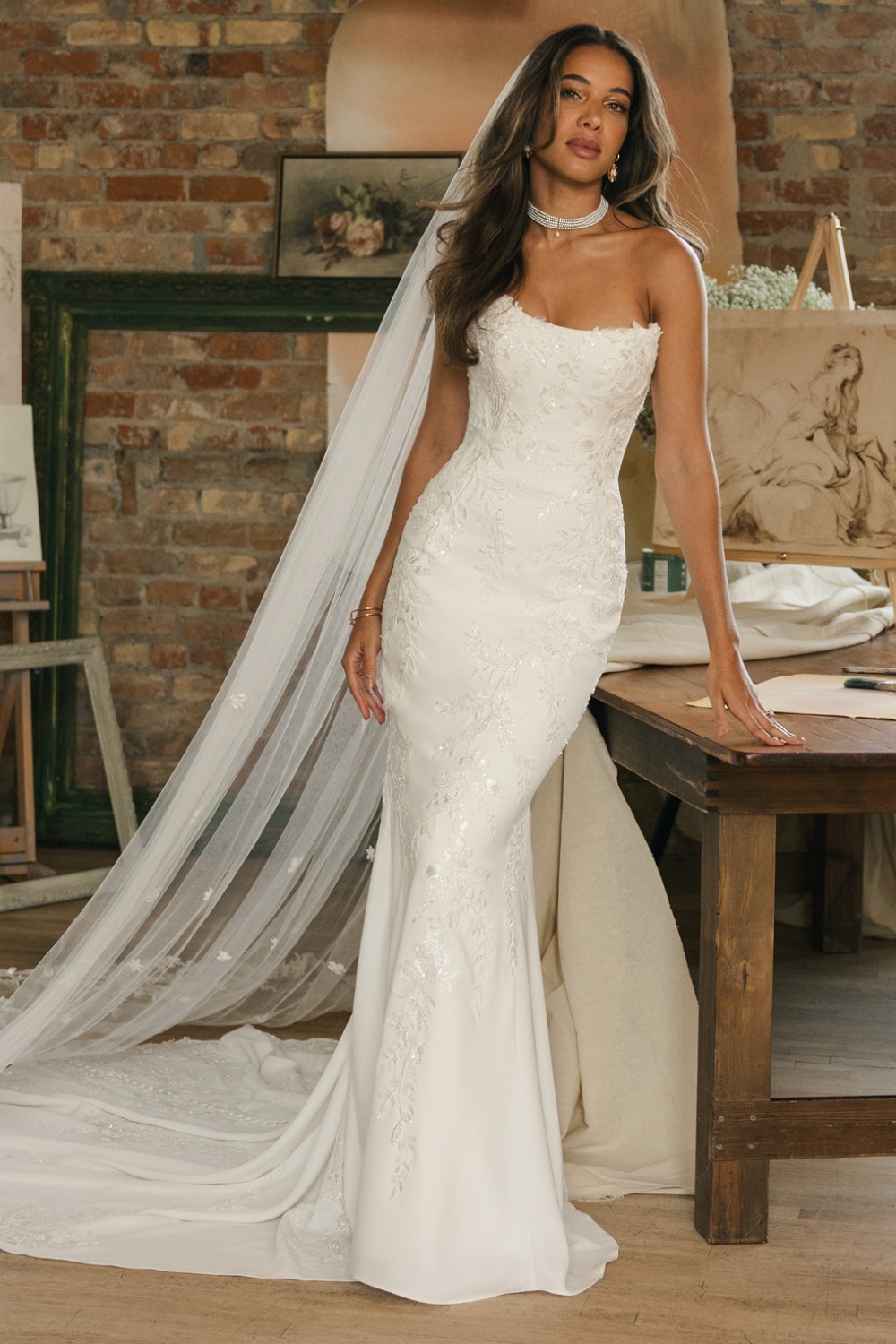 Trouwjurk THERA Maggie Sottero. Deze trouwjurk heeft een fit and flare silhouet strak aangesloten De halslijn is strapless en hartvormig, wat het decolleté mooi laat uitkomen. Het lijfje is gestructureerd en verstevigd. Deze trouwjurk is gedetailleerd met kantapplicaties en borduurwerk die over de hele jurk zijn verspreid. Deze details geven textuur en een luxe uitstraling zonder te druk te worden.