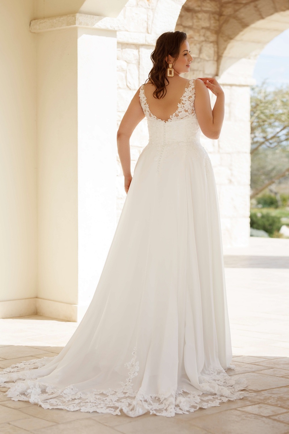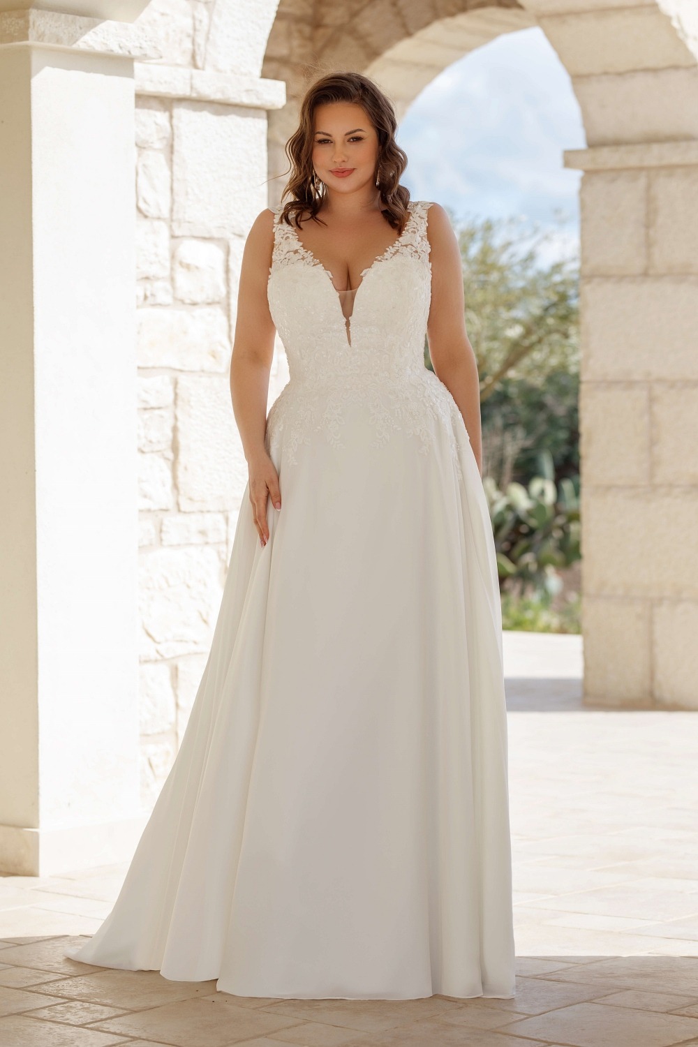 Trouwjurk TIBBE van het bruidsmode merk Jarice. Deze soepel vallende jurk is gemaakt van chiffon en heeft een smal A-lijn model. Het sweetheart lijfje is gevoerd en voorzien van kant dat iets doorloopt op de rok. Schouderbanden vormen een V-hals en blikvanger is de sleep met kantrand.